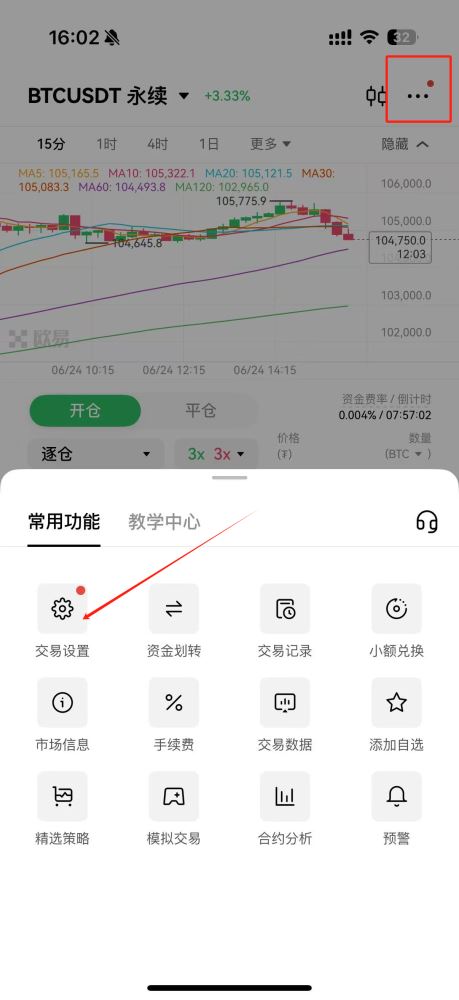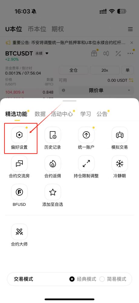 登录币安app后进入合约交易界面,点击右上角设置图标进入偏好调整页面。
