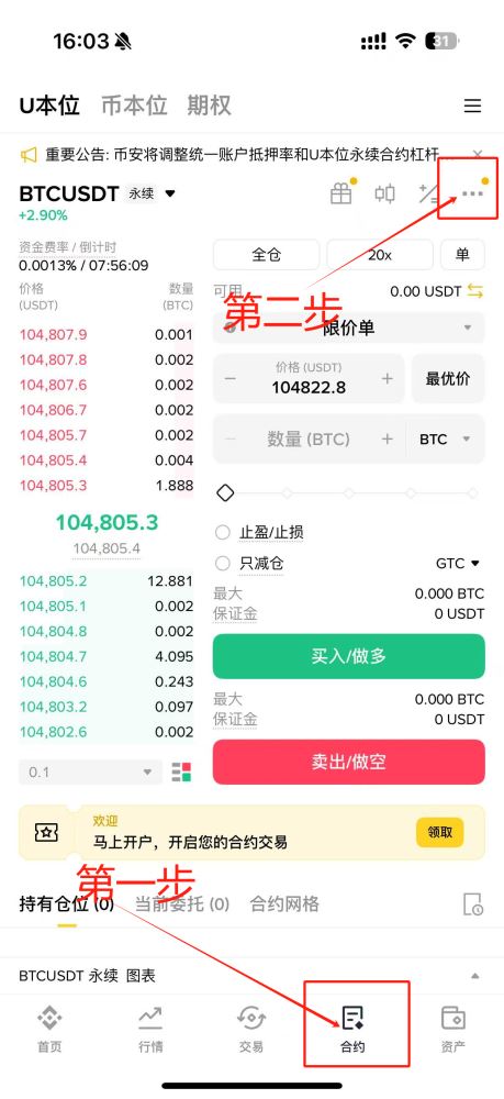 未开通合约账户需先行开通,随后在仓位模式中选择"双向持仓"选项。