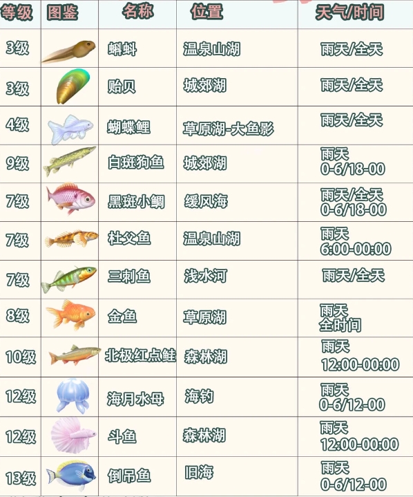 心动小镇3月3日是雨雪天气,这一天可以可拍五星鸟儿、钓限定时间出没鱼、雕雪雕,在不同时间段可以钓的鱼不同,以下是雨天钓鱼的图鉴分享。
