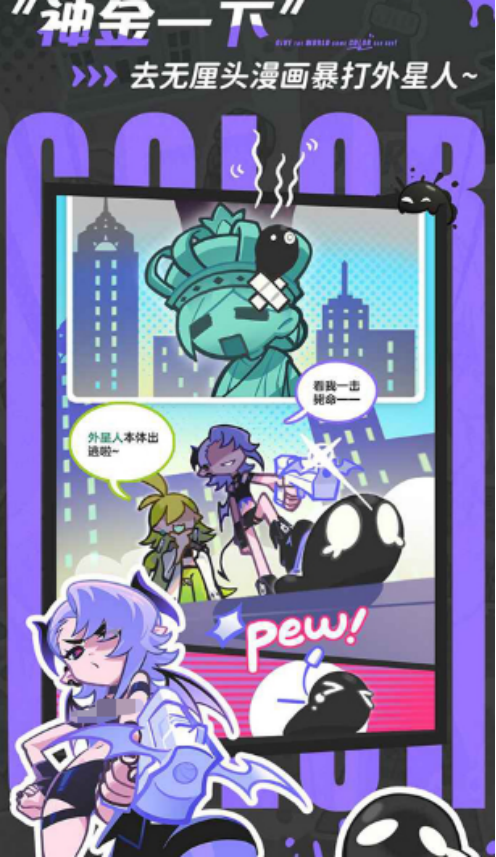 本作主打“神魔共养”系统——不同阵营的神明伙伴共享等级、技能与染色进度,避免重复培养资源浪费;所有角色均支持自定义涂装路径与特效颜色,强化个性化表达。核心玩法融合节奏BGM驱动的染色判定、3v3实时街区争夺战、以及基于网络热梗设计的抽象剧情关卡,配合呆萌捣蛋鬼NPC触发的随机爆炸事件,形成多层笑点叠加的沉浸式体验。