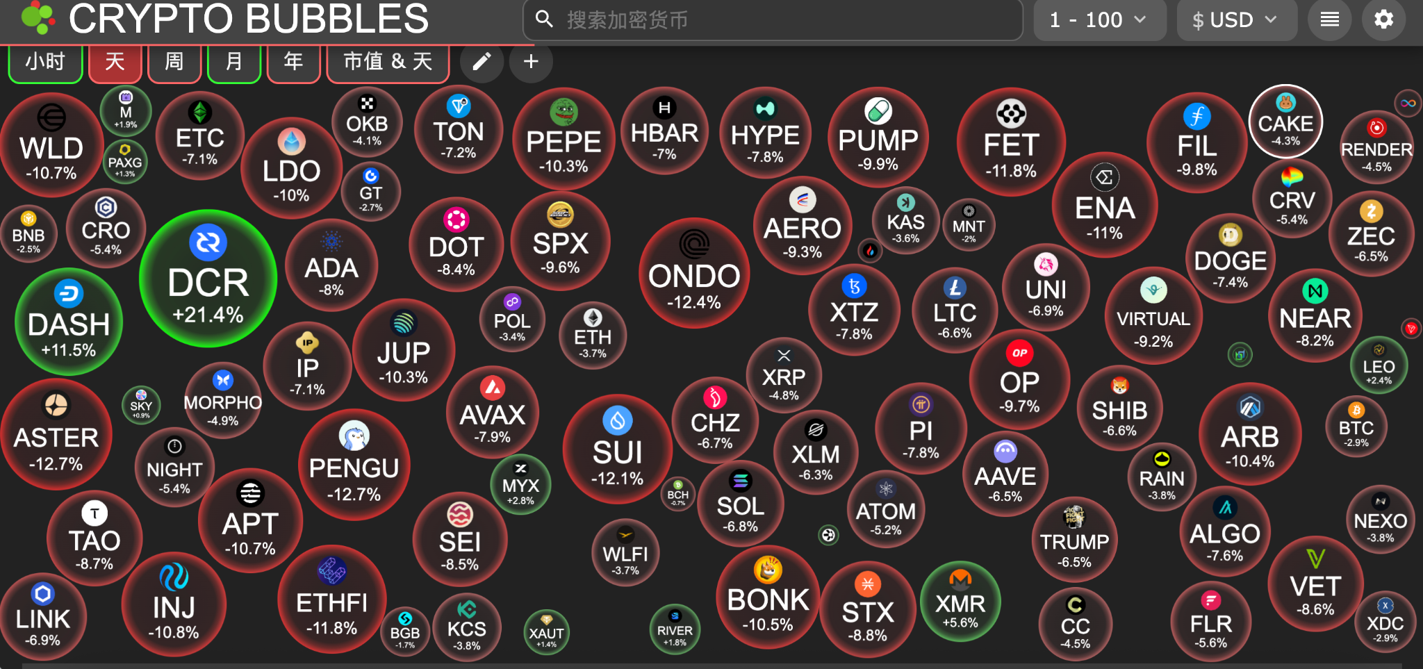 今日市值前100币种最大涨幅:Decred涨21.4%、Dash涨11.5%、Monero涨5.6%、MYX Finance涨2.8%、LEO Token涨2.4%。