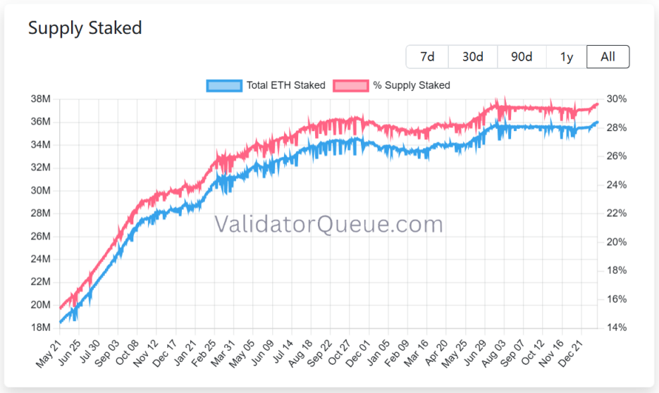 根据ValidatorQueue数据显示,截至2026年1月22日,以太坊质押规模达到了近1,200亿美元的历史新高,超过3,600万枚ETH处于质押状态,占流通供应量的约30%。