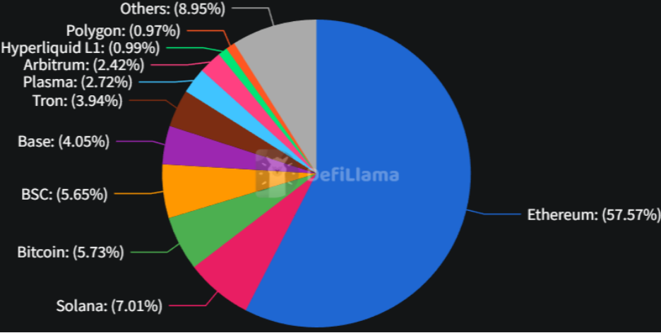 如果说TVL是以太坊的“肌肉”,那么稳定币则是其“血液”。截至1月22日,以太坊网络在稳定币领域的市占率已达约58%。在全球链上美元需求持续增长的背景下,以太坊作为稳定币的首发阵地,为其生态构筑了深厚的流动性护城河。
