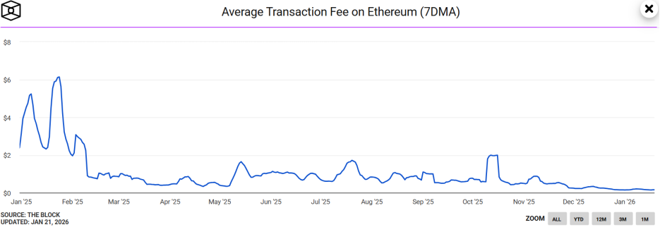同时,以太坊的7日移动平均Gas费降至0.03 Gwei以下的历史低点,单笔转账成本仅约0.15美元。