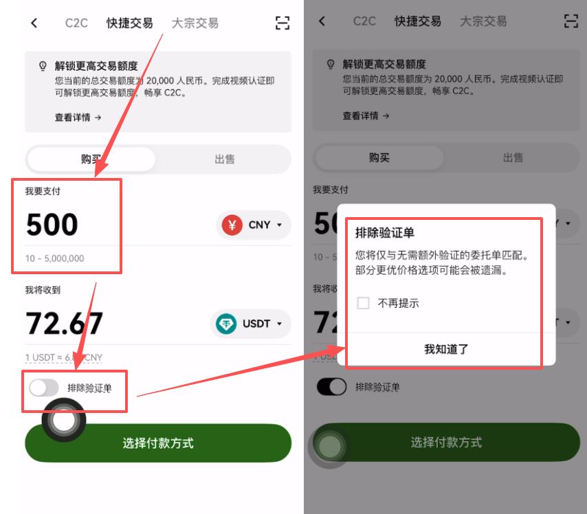 进入C2C买币与风控提示