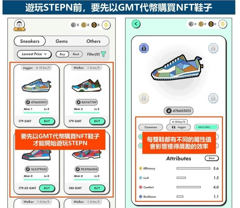举例来说,2022年推出的走路健身游戏《StepN》,就要玩家先兑换GMT代币购买鞋子,不同鞋子带来不同奖励。