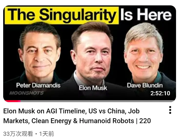 在这场名为"Moonshots#220"的播客中,三人展开了长达三小时的深入对话。马斯克明确指出,2026年为“奇点之年”,并详细阐述了支撑这一论点的工业、技术及经济基础,描绘出一幅由技术变革所重塑的未来图景。