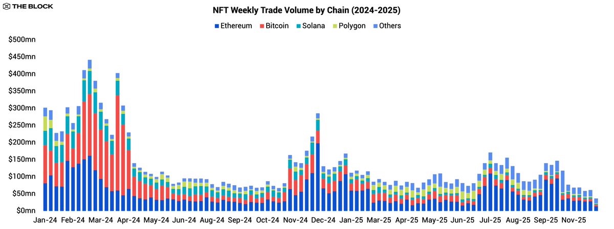 事实上,The Block的2025年报告也显示,全年NFT市场未见强劲的重新入场资金,投机热情大幅降温,且多链百花齐放的格局也回归到以太坊主导。这一年的总交易额降至55亿美元,相比2024年下降约37%;NFT总市值从约90亿美元大幅缩水至约24亿美元。