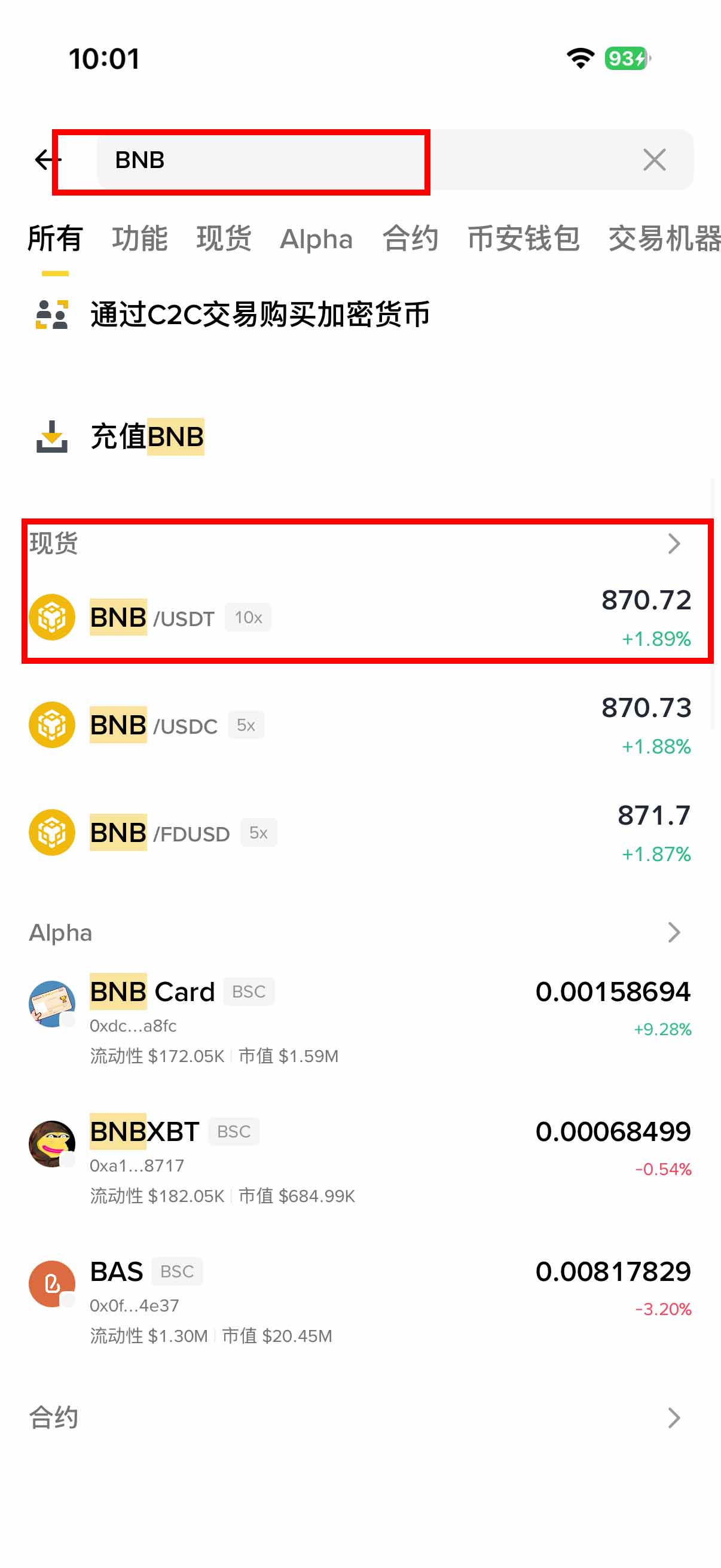 入金之后,即可在币安用 USDT 购买 BNB。