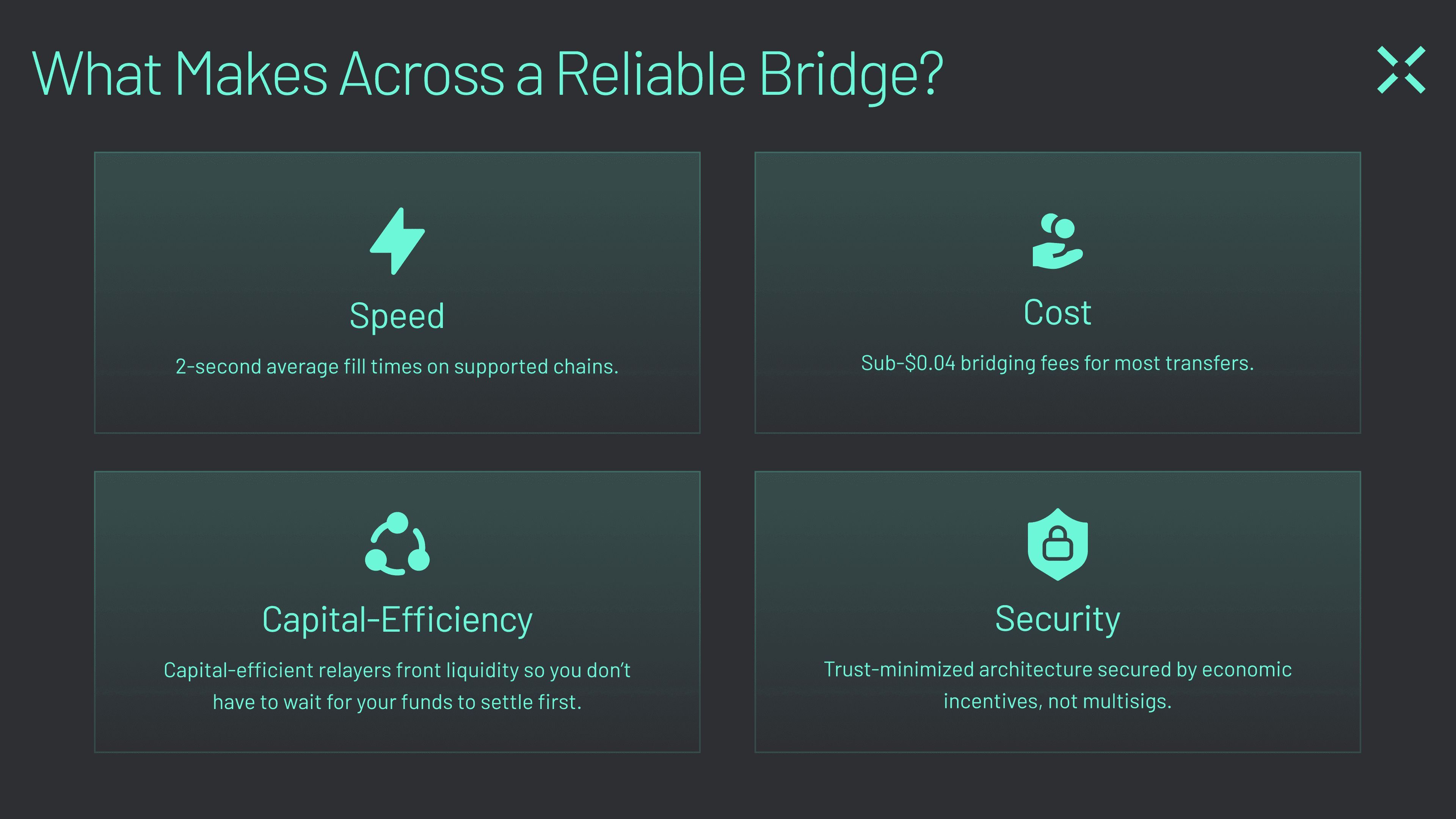 在支持的链上的平均填充时间为 2 秒。大多数转账的桥接费用低于 0.04 美元。资金效率高的 relayers提供前端流动性,因此你无需等待你的资金首先结算。由经济激励而非多重签名保护的最小化信任架构。它快速、轻量且安全。并且最近添加了对 BNB 链的本机支持。