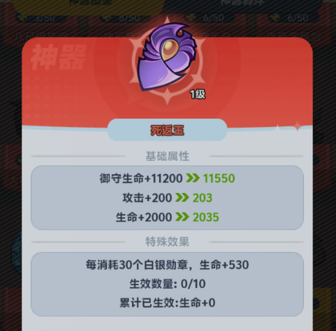 以高人气神器“死返玉”为例:基础属性提供攻击与生命值双增益,专属效果具备明确成长性——每消耗30枚白银勋章,额外提升530点生命值,最高可叠加10层,即总计+5300生命值。该增益对前排承伤能力与后排持续作战能力均有质的提升。所有新获神器,首步必须升至10级,这是激活全部基础属性的前提条件。切忌资源囤积,早期等级夯实,是中后期高阶突破的底层保障。