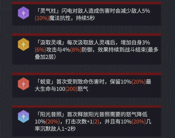 被动技能体系涵盖三层核心机制:灵气柱命中敌人后,可降低目标5%~10%魔法抗性,持续5秒且支持叠加,大幅减轻队伍对减抗辅助的需求;萃取灵魂每次触发提升3%~6%攻击力,最多叠加两层并持续至战斗结束;蜕变机制提供类复活效果,首次承受致命伤害时将保留10%~20%最大生命值,同时反制打出输出;阳光普照则兼具怒气削减与概率沉默效果,在限制敌方节奏的同时维持自身输出节奏。
