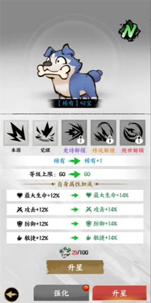 升星效果:升星将赋予变身强大的增幅光环,提升基础属性的百分比数值,解锁更高的等级上限。甚至在达到特定星级后,还能解锁额外的的被动技能,让你的变身攻击如虎添翼!