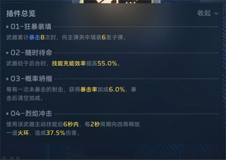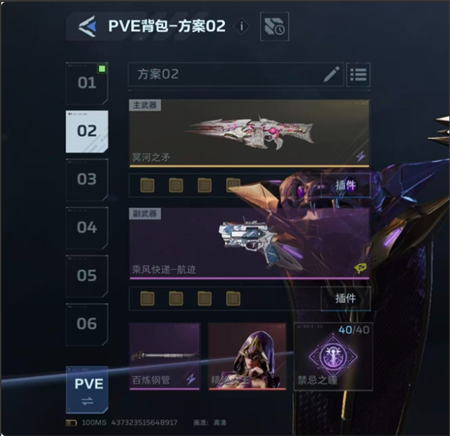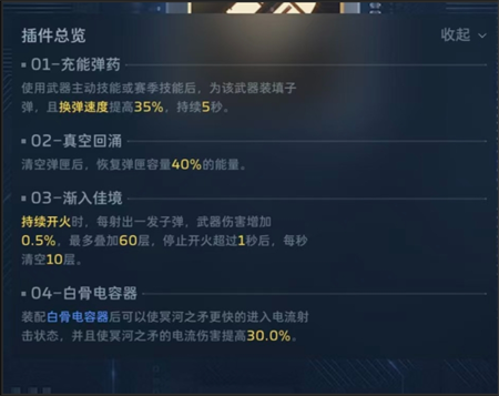 所以这里2号插件和纯白是有区别的,冥河之矛得2号要带真空回涌,不要无限续子弹,要等到打空子弹,触发换单动作,并且能量已经涨了之后,直接用乘风技能打断换弹动作,继续输出,一定要打空子弹并且能量恢复之后在使用乘风,这样的话,基本上21秒就能充能完成,21秒一个大,另外就是4号要带专插,