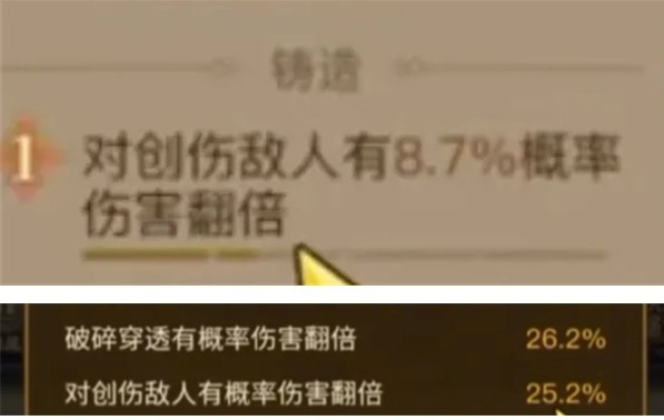 ②武器、护腕、护手的五六词条需洗“对创伤敌人有概率伤害翻倍”,该词条必须有且需强化,详细属性中该词条加起来最好达到25以上。