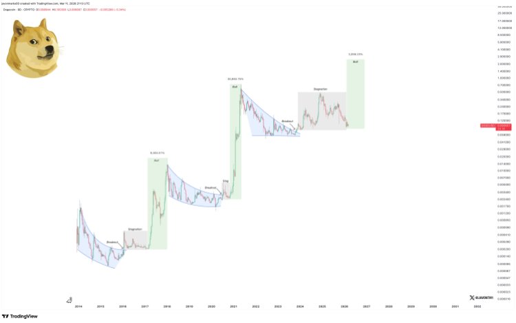 分析师并未将2023至2025年的走势视为实质性突破,而是归类为停滞期的一部分。这意味着狗狗币价格仍处于蓄力阶段,为下一轮上涨做准备。