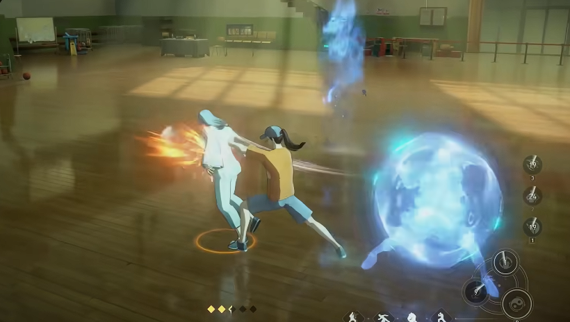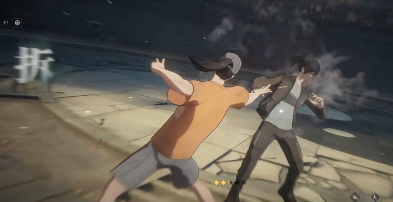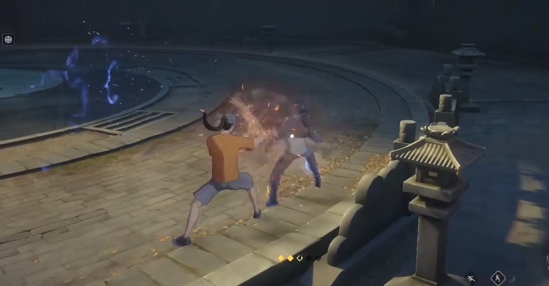 一技能“旋身飞踢”具备位移与追击双重属性,可作为连招起手式使用。命中后若敌人处于凝焱火覆盖区域,将自动触发“吸焰”机制,使该次飞踢转化为高伤害的“险招”,显著提升输出效率;若未触发环境互动,则默认为“平招”,伤害相对基础。二技能为短CD突进技,兼具接近与控场功能:施放瞬间可依据随机浮现的“震”“坤”“离”三字印,产生差异化效果——“震”引落雷造成范围伤害,“坤”自地面生成地菱并附带击飞,“离”则投掷凝焱火团,接触即爆并强制倒地。该技能前摇短、机动性强,适合在连招中穿插调整站位或衔接后续体术输出。