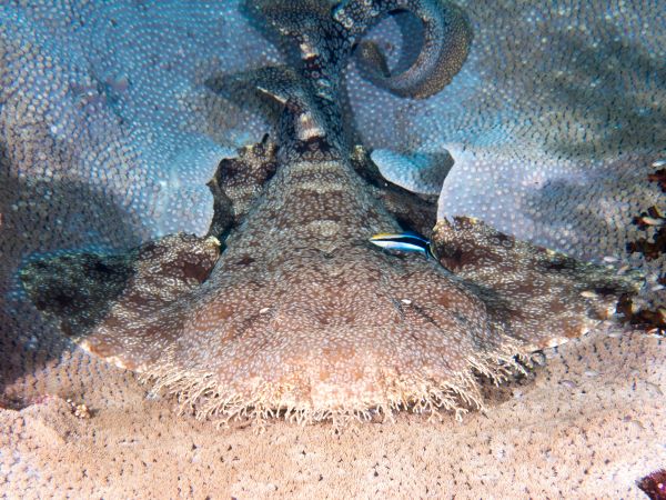 叶须鲨是海洋中的“伏击高手”。它不仅能凭借身上的斑纹完美隐藏在海草或珊瑚礁中,还会左右摆动尾巴,模仿游动的小鱼来吸引猎物,然后以迅雷不及掩耳之势将其吞下。