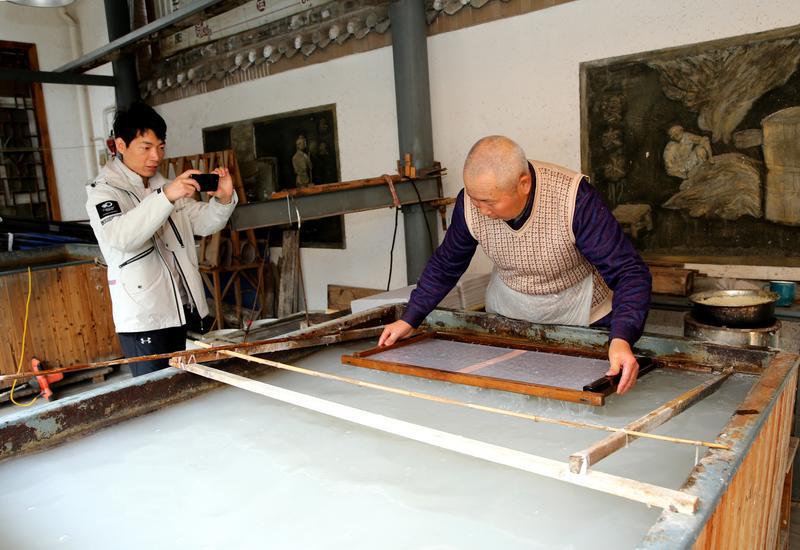 捞纸(又称抄纸)是宣纸制作的传统工艺中最核心的工序之一。它是将纸浆从纸槽中捞出,使宣纸初步成型,并决定纸张厚度和尺寸的关键步骤。