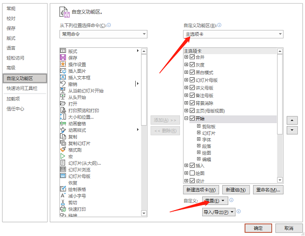 4、在"选项"对话框中,选择"自定义功能区"选项,并在右侧窗格中找到并选择"主选项卡"。然后点击下方的"重置"按钮,并确认重置操作。这将还原菜单栏和工具栏的默认设置。