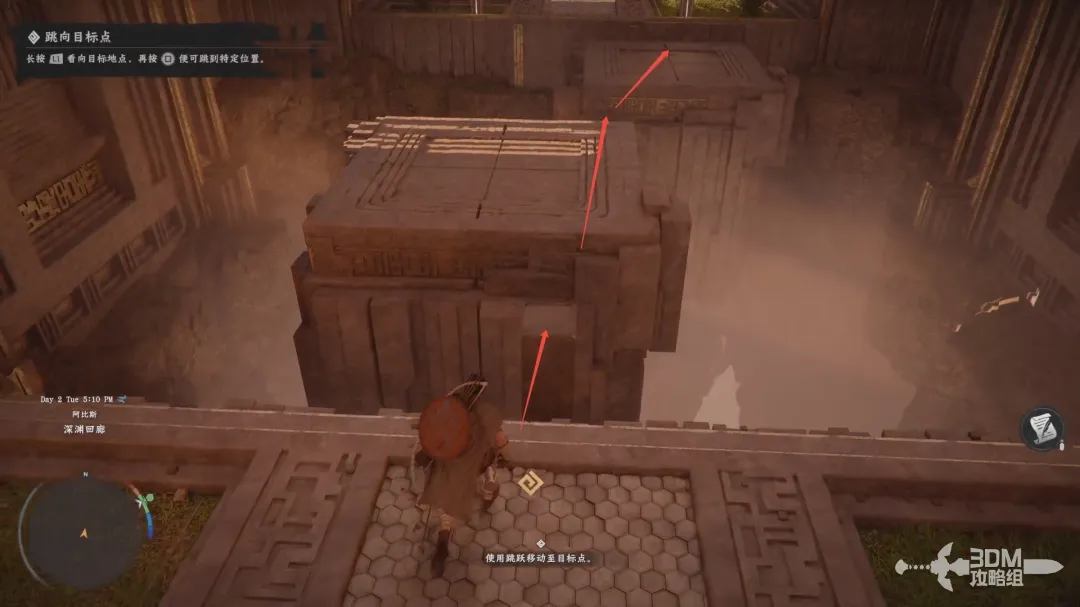 按住L1(左肩键)屏幕中会出现一个蓝色指示点,将指示点对准石柱上,按方块键可以直接跳跃至蓝色光点指示区域。