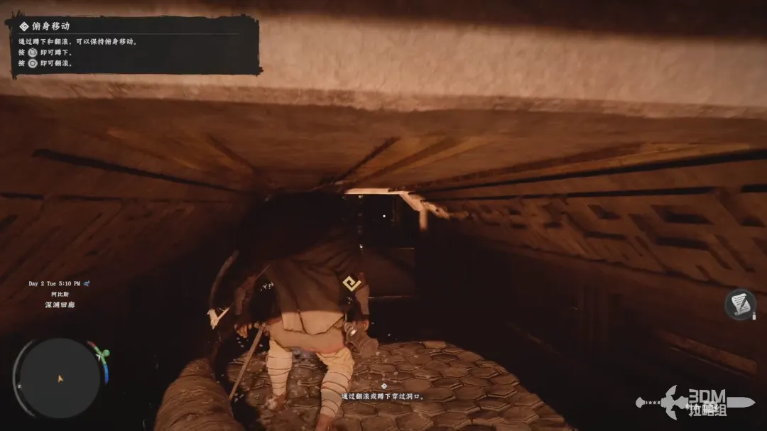 继续往前走,按下右摇杆蹲下穿过低矮的山洞。