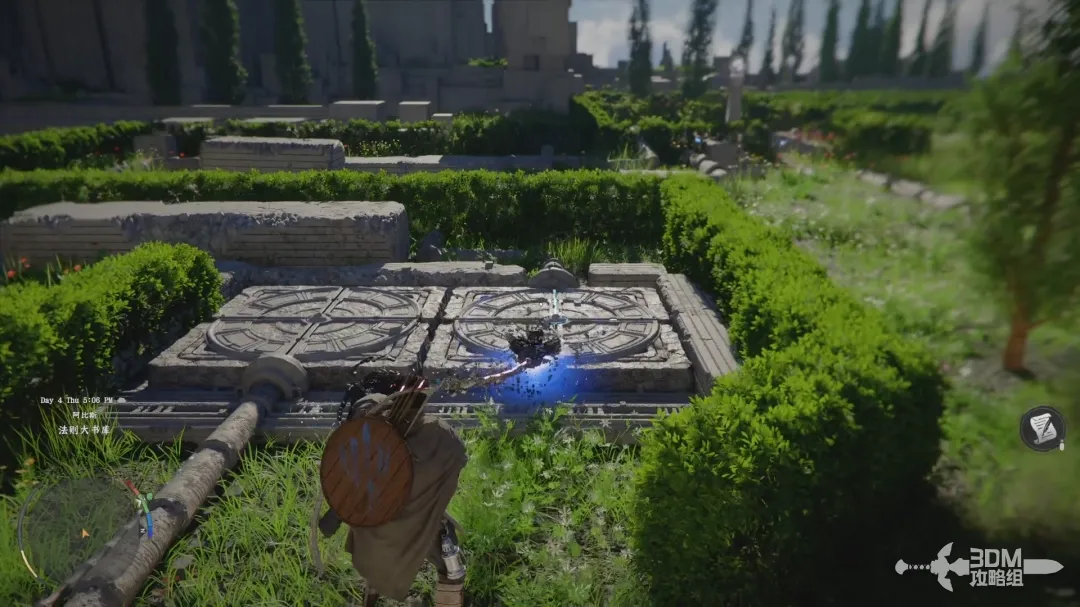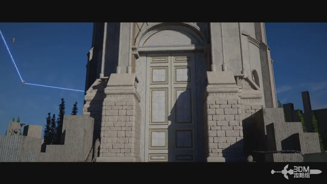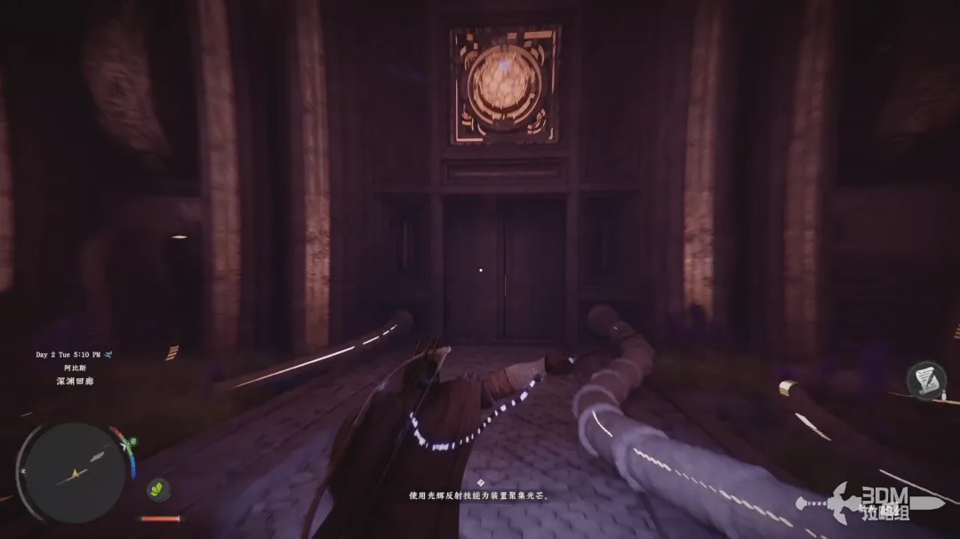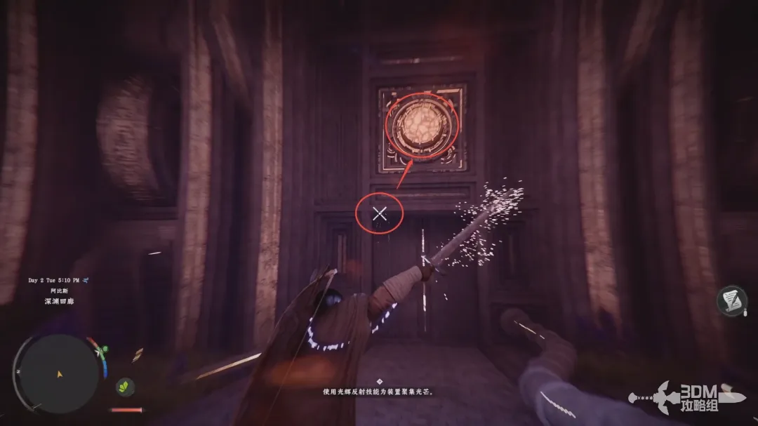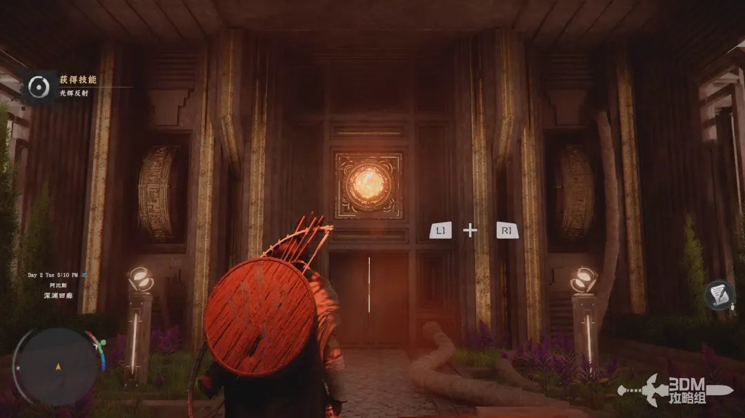 然后不要松开左手的L1(左肩键);松开右手R1(右肩键)然后再按下R1(右肩键)进入反射模式,此时屏幕中间会出现叉型的指示,使用右摇杆将视角对准石门上面的装置即可开门。