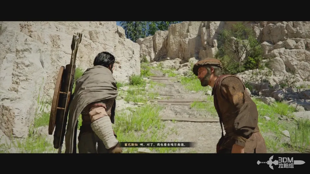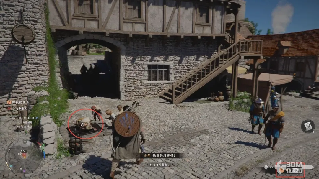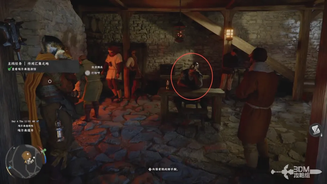 挑战成功后,走出酒馆,后酒馆旁边下水道井盖上德老人对话,按住L1朝向老人,再按互动键对话。