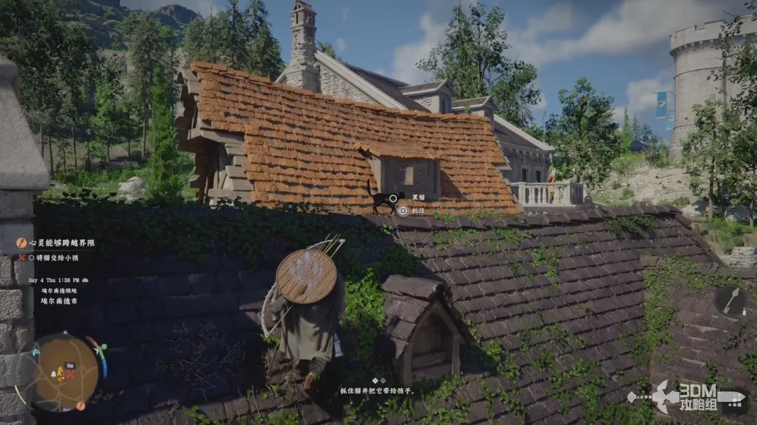 爬上房顶并且抓住黑猫,然后再将黑猫重新交还个小孩。