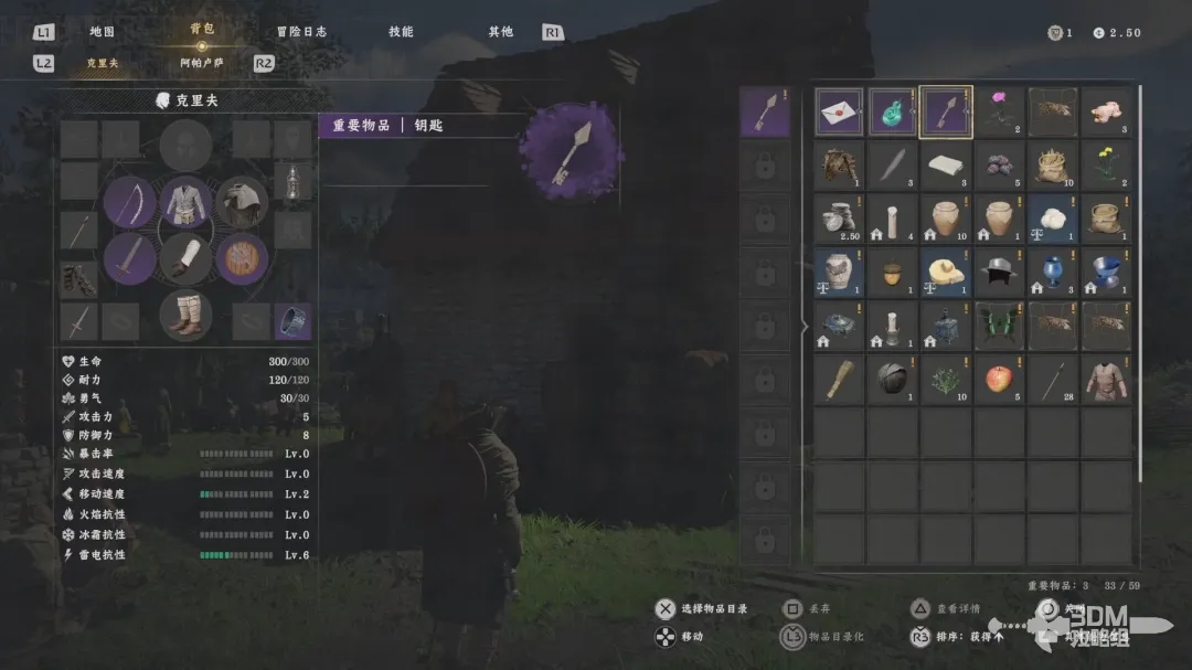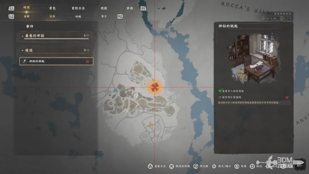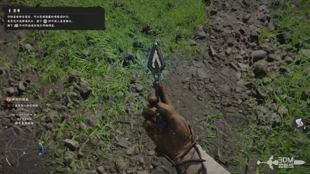 然后打开背包选择钥匙,按下X进入查看模式,按下左肩键可以对所选道具进行详细查看。