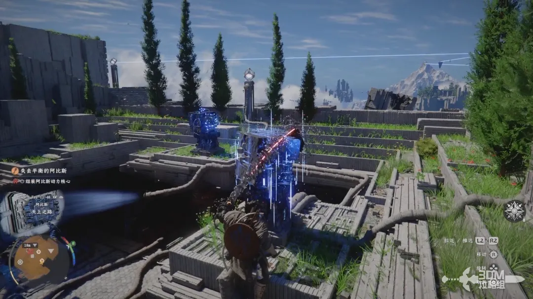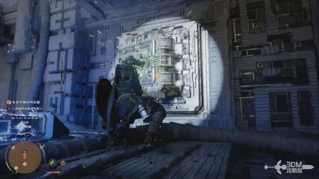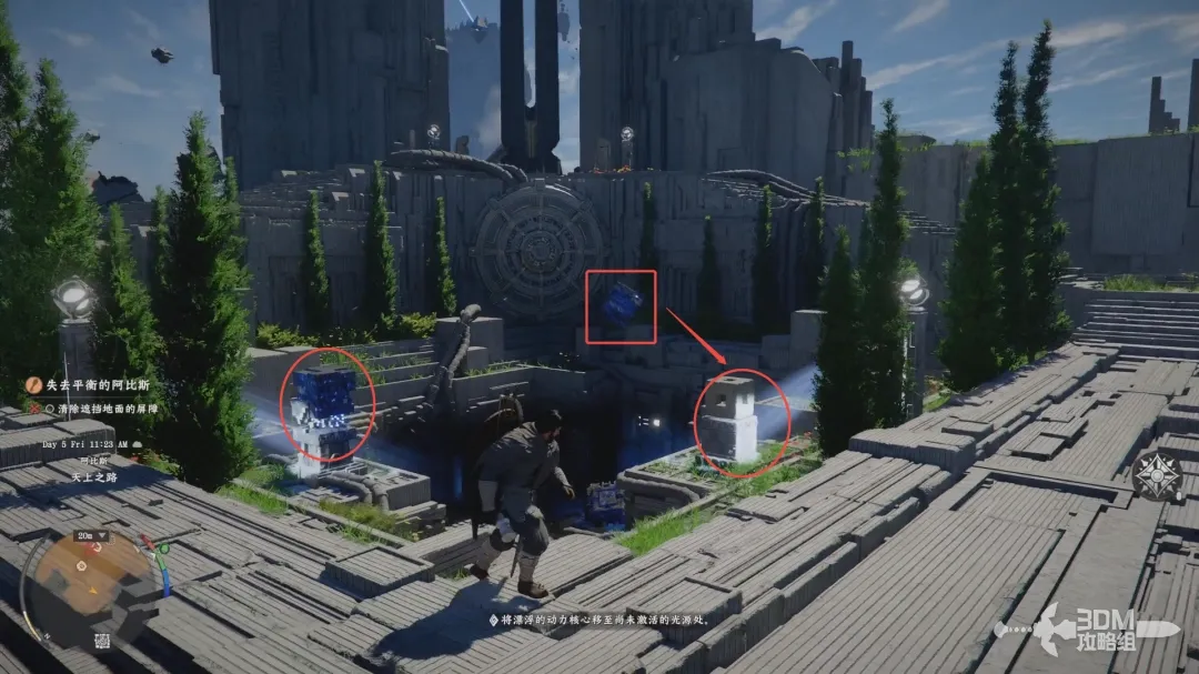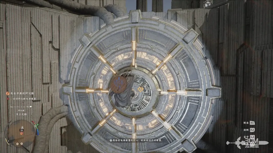 然后爬到电源装置的中心,再长按右摇杆释放劲法启动装置。