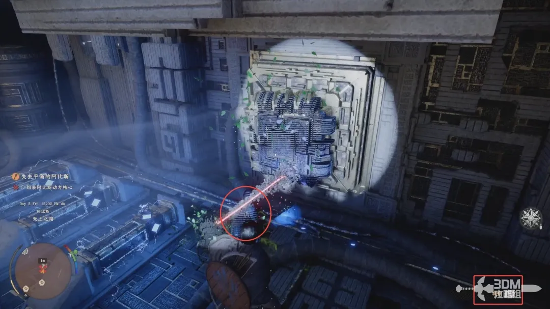 再跳下去,使用钩爪拖动中央处理器一样的阿比斯动力核心,放到墙上的空缺处。