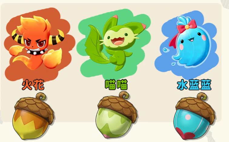 三只初始宠物分别为:草系的喵喵、火系的小火苗、水系的水蓝蓝。三者均属高适配性起始精灵,在前期资源有限的情况下,均可胜任推图、打野、任务等常规需求。属性克制关系虽存在,但在低等级阶段影响有限,整体强度均衡,不存在明显短板。
