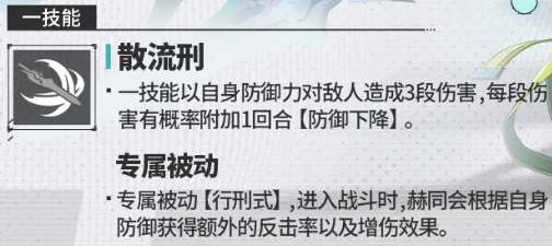 赫同的普通攻击名为“散流刑”,是一套三段式单体连击技能。每段造成相当于自身125%防御值的伤害,并有25%概率使目标陷入“防御下降”状态(持续1回合)。该效果虽不可叠加,但可多次触发,显著提升敌方破防效率。此外,每当成功触发防御下降,赫同自身将获得500点固定防御加成;同时,其反击成功率提升12%,最终伤害提升6%,形成攻守兼备的良性循环。