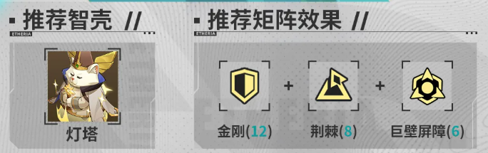装备搭配方面,推荐智壳选用“灯塔”,矩阵组合优先考虑“金刚”“荆棘”与“巨壁屏障”。此类配置能最大化强化赫同的防御成长路径,从而反向提升其反击触发率与百分比增伤收益,实现“越肉越强”的独特养成逻辑。