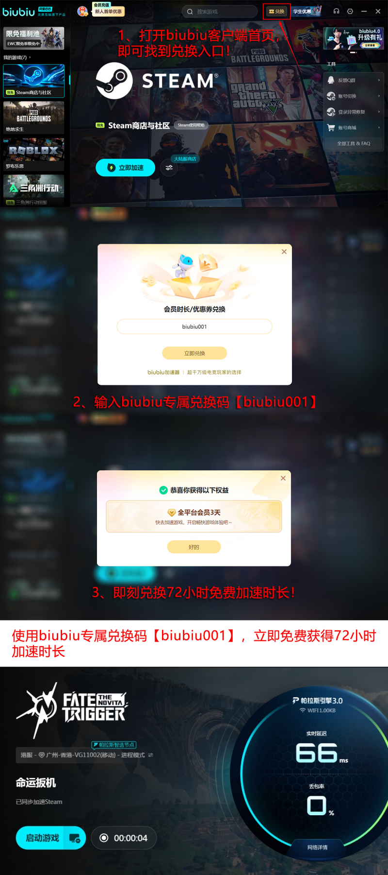 当前用户可申领免费加速时长:输入兑换码【biubiu001】即可获得3天使用权;新用户完成首次注册后,额外获赠24小时新手加速权益。两项福利叠加可享总计96小时的连续加速服务,保障高强度对局中的操作响应与战局判断稳定性。