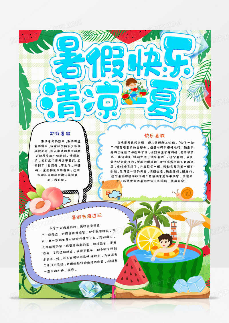 总之,夏日假期手抄报的创意丰富多彩。通过鲜明主题、生动插画、巧妙文字排版、创意边框和互动元素的精心组合,一份独一无二的手抄报就能呈现在眼前。让我们在夏日假期里,拿起画笔,发挥创意,制作出属于自己的精彩手抄报,留下美好的回忆。