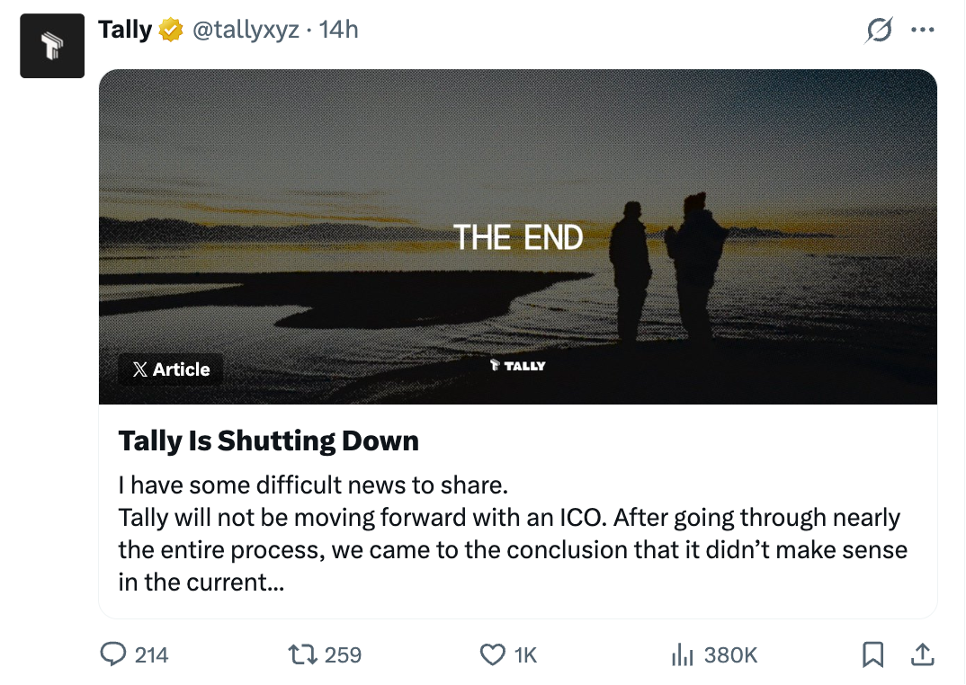 而在 Tally 发布的公开信中,CEO Dennison Bertram 揭示了 Tally 落幕的直接原因。同时,这一原因也如同一面镜子映照出了当前 DAO 治理领域的深层困境。(相关阅读:2026年加密项目关停、转型、破产名单)