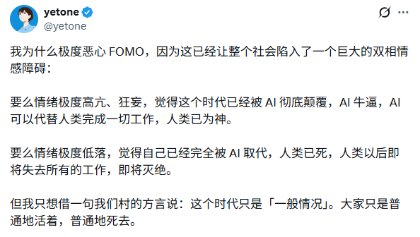 正如 AI 开发者 @yetone 在社交媒体上直言不讳:「我极度恶心 FOMO,这已经让整个社会陷入了一个巨大的双相情感障碍:要么情绪极度高亢,认为人类已为神;要么情绪极度低落,觉得人类已死。」