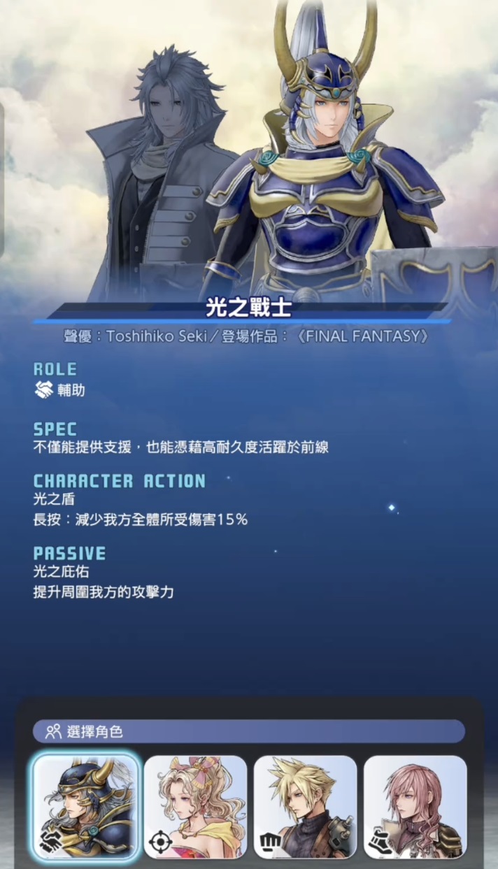 本作角色全部源自《最终幻想》系列经典人物,涵盖光之战士、萨菲罗斯等标志性形象,并按战斗职能划分为重装、射击、敏捷、支援四大类型。每位角色配备差异化技能树与主动/被动技组合逻辑,阵容构建需兼顾属性克制、技能衔接与站位协同,策略深度明显提升。对于系列老玩家而言,这是沉浸式重温情怀的优质载体;对新接触该IP的用户,则提供了清晰易懂的角色认知路径。
