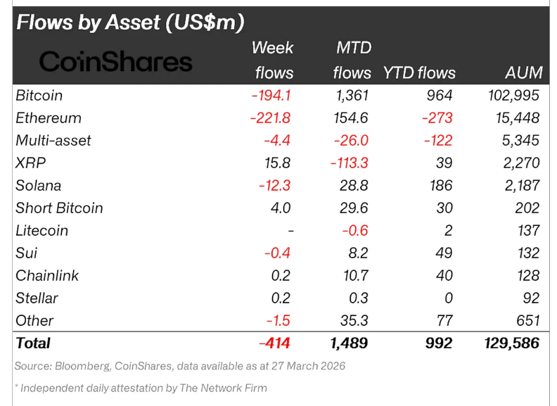 投资者因通胀和伊朗战争忧虑加剧,从加密货币基金撤资4.14亿美元