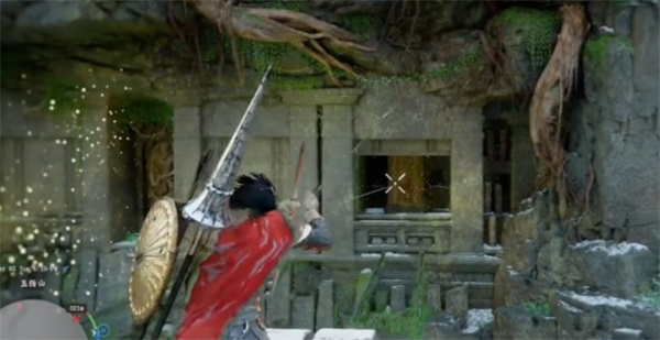 石门后有三根可转动石柱,切换弓箭,用射击精准击打石柱侧面,使其旋转,将每根石柱面朝玩家的图案,