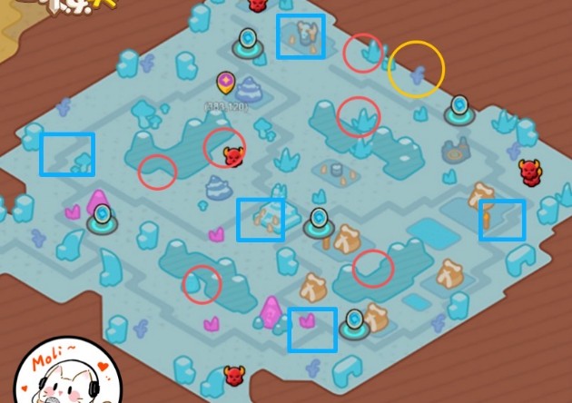 英雄击碎冰柱后获得的”雪花“buff可以叠加,累积4层时,可以到黄圈位置击碎石头,开启隐藏入口;
