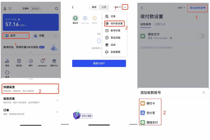 首次卖币需绑定收款账户:包括储蓄卡/支付宝/微信等支付工具。操作路径:买币-快捷买卖-更多设置-收付款管理-添加收款账号