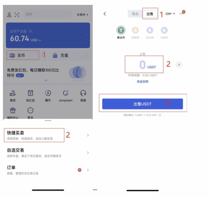 以USDT为例:买币-快捷买卖-出售页面-输入数量-确认交易。收款时需验证资金到账情况后输入密码完成交割