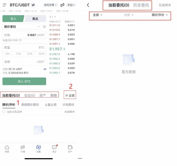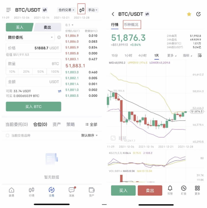市场深度查看:交易页面右侧可实时查看买卖挂单情况,红色区域为卖盘,绿色区域为买盘