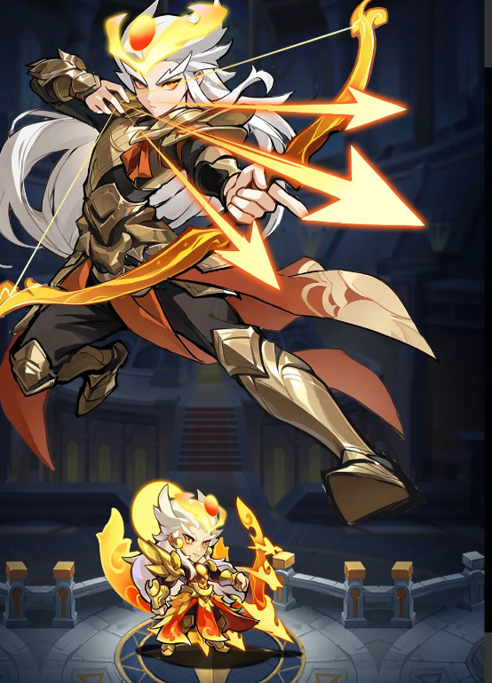 定位为高频火系范围输出型角色。主动技能“落日弓矢”具备三段连续火属性伤害判定,攻击范围覆盖中等扇形区域;另一主动技“金乌坠空”可召唤多只金乌自空中俯冲打击,共触发五次火系伤害,具有显著的AOE压制能力与持续灼烧叠加潜力。