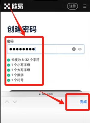 设置密码时需注意密码强度提示,当所有条件满足显示绿色标记后即可完成账户创建。