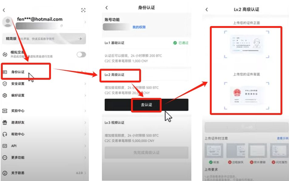 L2高级认证需要上传身份 证照片,主要影响交易额度上限,用户可根据需求选择是否完成。
