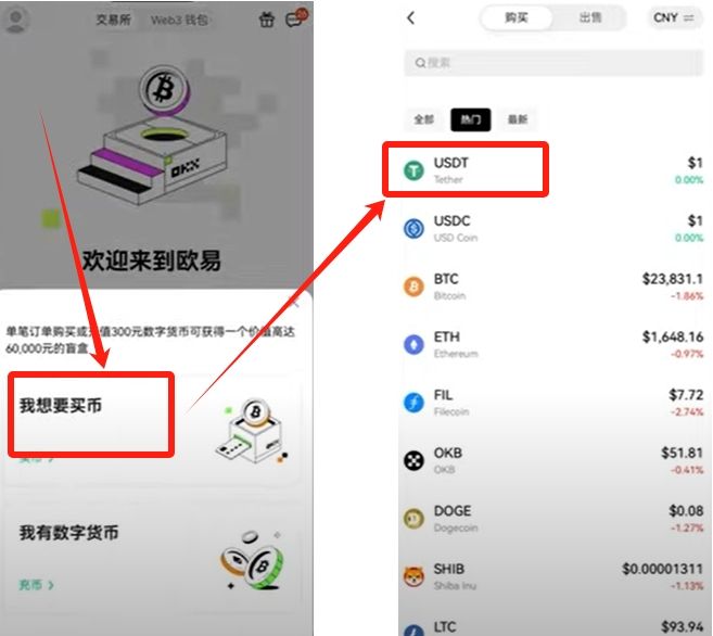 通过"购买或充值数字货币"入口选择USDT作为中间兑换币种,使用r民币完成首笔交易。